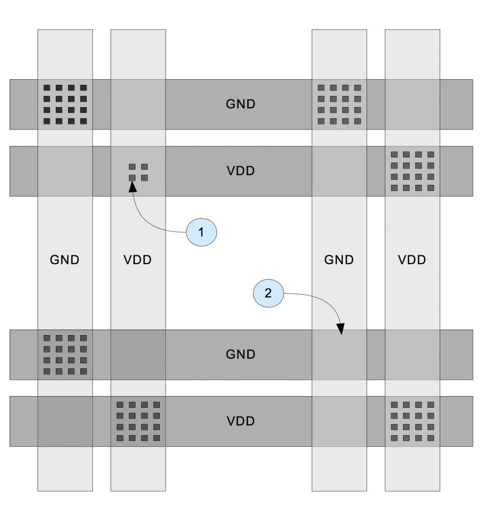 Each via being quite resistive, it is expected to have the maximum number of vias at each intersection in order to reduce the parasitic resistor.[5] The blocks which are placed below this grid are then powered by connecting their VDD and GND pins to any of the upper strips through vias. This technique allows to have a good distribution of the power across the whole chip and dramatically reduces voltage drop or ground bouncing in the different blocks of the chip. Next figure shows a typical power grid.