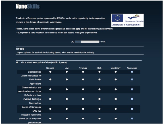 NanoSkills[Nan, 2012] is a project belonging to Leonardo program and sponsored by EACEA[EAC, 2012]. Its is developed by a consortium of both universities and SMEs. The role of the the universities is to develop online courses on nanoelectronics while the SMEs will help to setup a professional environment and to validate it. The goal of the project is to provide master level courses to both students and employees. The content of the courses should bring the learners, the skills expected by the industry to work on the most advanced topics of nano-electronics. In order to fulfill the industry needs, a preliminary analysis has been performed among the various customers. This paper describes this analysis. We will fist detail the elaboration of the questionnaire. We will then review the answers, and finally analyze the results in order to select the most important courses to be developed.